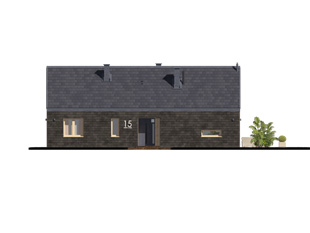 Paproć 4 to projekt domu parterowego zaprojektowany w stylu nowoczesnej stodoły. Ideą projektów w tym stylu jest wykorzystanie prostej konstrukcji i nadanie jej współczesnego wyglądu w postaci wysokich przeszkleń oraz nowoczesnych materiałów wykończeniowych. Projekt pomimo prostej bryły prezentuje się niezwykle ciekawie. Posiada oryginalnie wykończoną elewację oraz dopracowany w każdym szczególe układ funkcjonalny. Zwarta bryła budynku została zaprojektowana na rzucie prostokąta. Przykryto ją dwuspadowym dachem bez okapów, co jest charakterystyczne dla tego typu domów. Na elewacji pojawiła się płytka elewacyjna w ciemnoszarym kolorze oraz deska elewacyjna w kolorze naturalnego drewna. Dach został pokryty dachówką w grafitowym odcieniu.