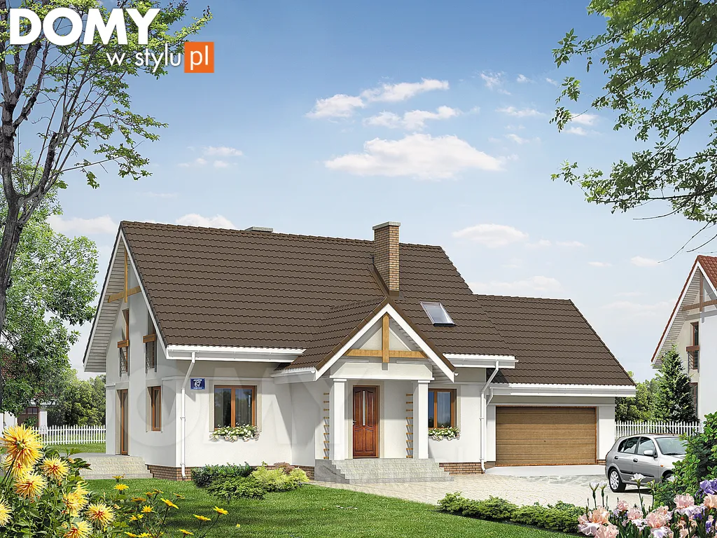 Sójka 3 to projekt domu parterowego z użytkowym poddaszem. Budynek jest niezwykle urokliwy i ma cechy niewielkiego dworku. Prosta bryła jego głównej części została powiększona o przybudówkę garażu oraz umieszczony centralnie na frontowej ścianie klasyczny ganek. Trójkątny szczyt ganku wsparty na symetrycznie rozmieszczonych kolumnach stanowi zadaszenie strefy wejściowej i nadaje budynkowi charakteru.